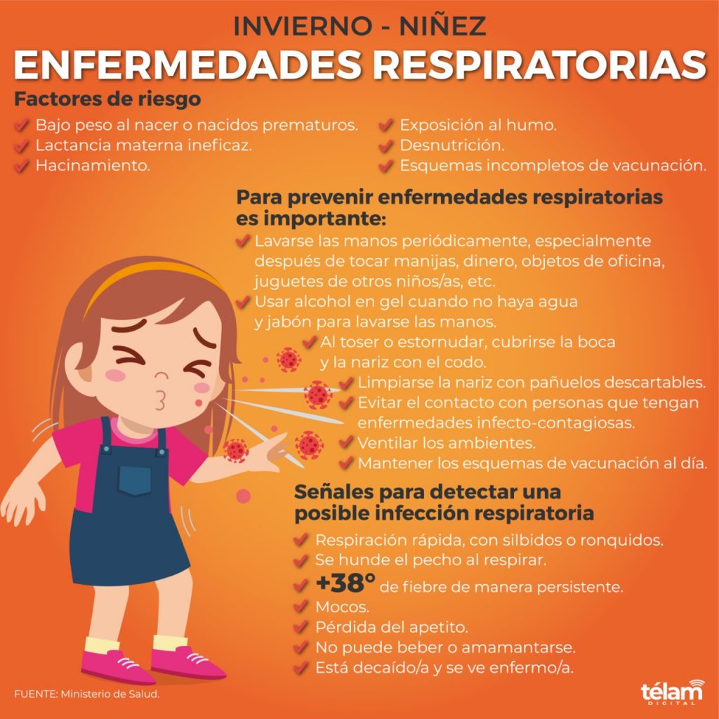 El Ministerio de Salud advirtió que los factores de riesgo frente a la circulación de los distintos virus respiratorios que se producen con la llegada del frío en niños y niñas son el bajo peso al nacer o nacidos prematuros; lactancia materna ineficaz; hacinamiento; exposición al humo; desnutrición; y esquemas incompletos de vacunación.