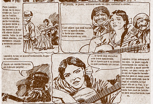 No faltaba a las fiestas. Asistía con su guitarra encordada a la zurda, el mástil adornado con cintas que representaban los colores de todas las banderas americanas y, sin hacerse rogar, cantaba improvisadas coplas con sucesos de la zona y, más atrevida, algunas recetas rimadas de su medicina empírica. Siempre se le privilegiaba un lugar en la reunión y ella lo compartía con su belleza personal y su inseparable guitarra. Se dice también que nunca tuvo un amor y esa pena se reflejaba en sus cantares.