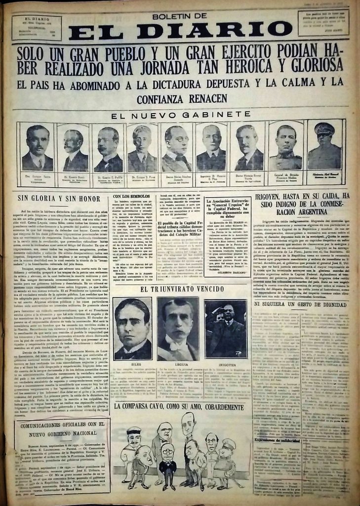 En el desarrollo de la noticia caracterizaba al gobierno depuesto como “la bárbara dictadura que durante casi dos años soportó el país. Yrigoyen y sus cómplices han abandonado el gobierno sin un sólo gesto de entereza y de dignidad sin una sola reacción viril.” Y acusaba a los gobiernos provinciales leales al presidente de no “intentar un movimiento de resistencia. Todos han inclinado tímidamente la cerviz ante la revolución, que pretendían ridiculizar horas antes, como la inclinaban ayer ante el látigo del dictador.”