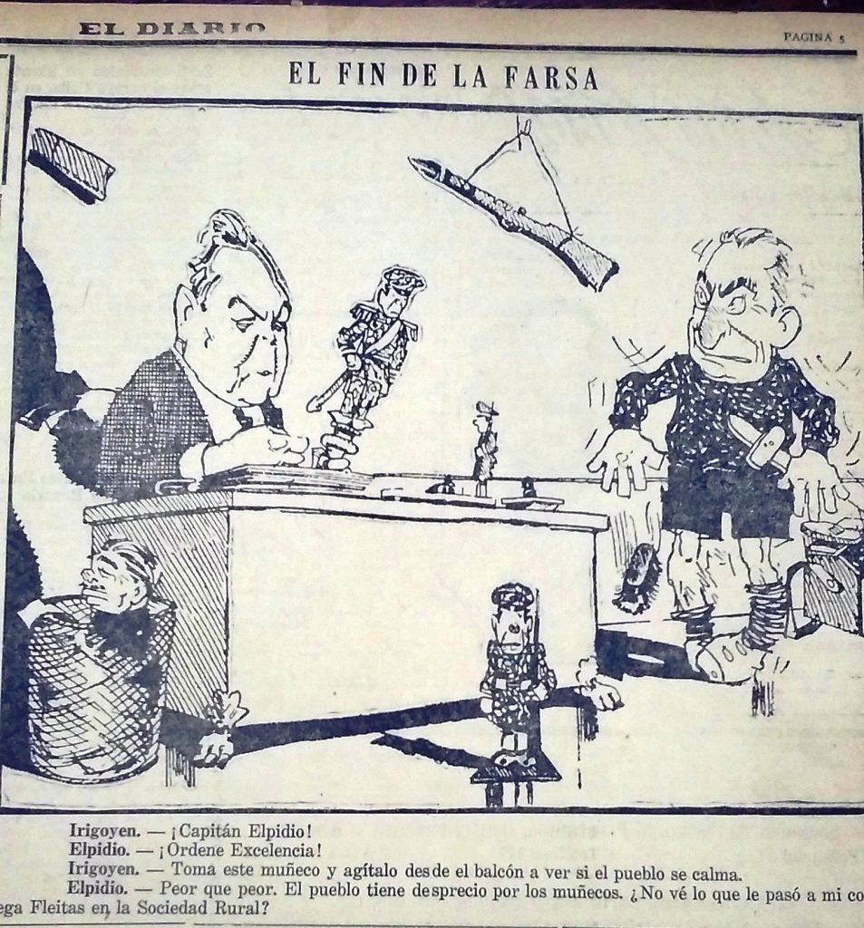En la provincia, El Diario de Paraná, que en ese momento dirigía Ernesto Sanmartino (había sido fundado por Luis L. Etchevehere como vocero de la UCR), publicaba una caricatura, en la víspera del golpe, con el título “El fin de la farsa” que mostraba al aún presidente Yrigoyen y al vicepresidente Elpidio González manipulando soldaditos de plomo. En el diálogo el presidente le pide a González que muestre al muñeco uniformado en el balcón de la Casa Rosada para “calmar al pueblo”, a lo que su interlocutor le responde que puede lograr el efecto contrario como le había pasado al Ministro de Agricultura y Ganadería Juan Bautista Fleitas en la exposición de la Sociedad Rural, víctima de la tradicional silbatina de los dueños de las reses.