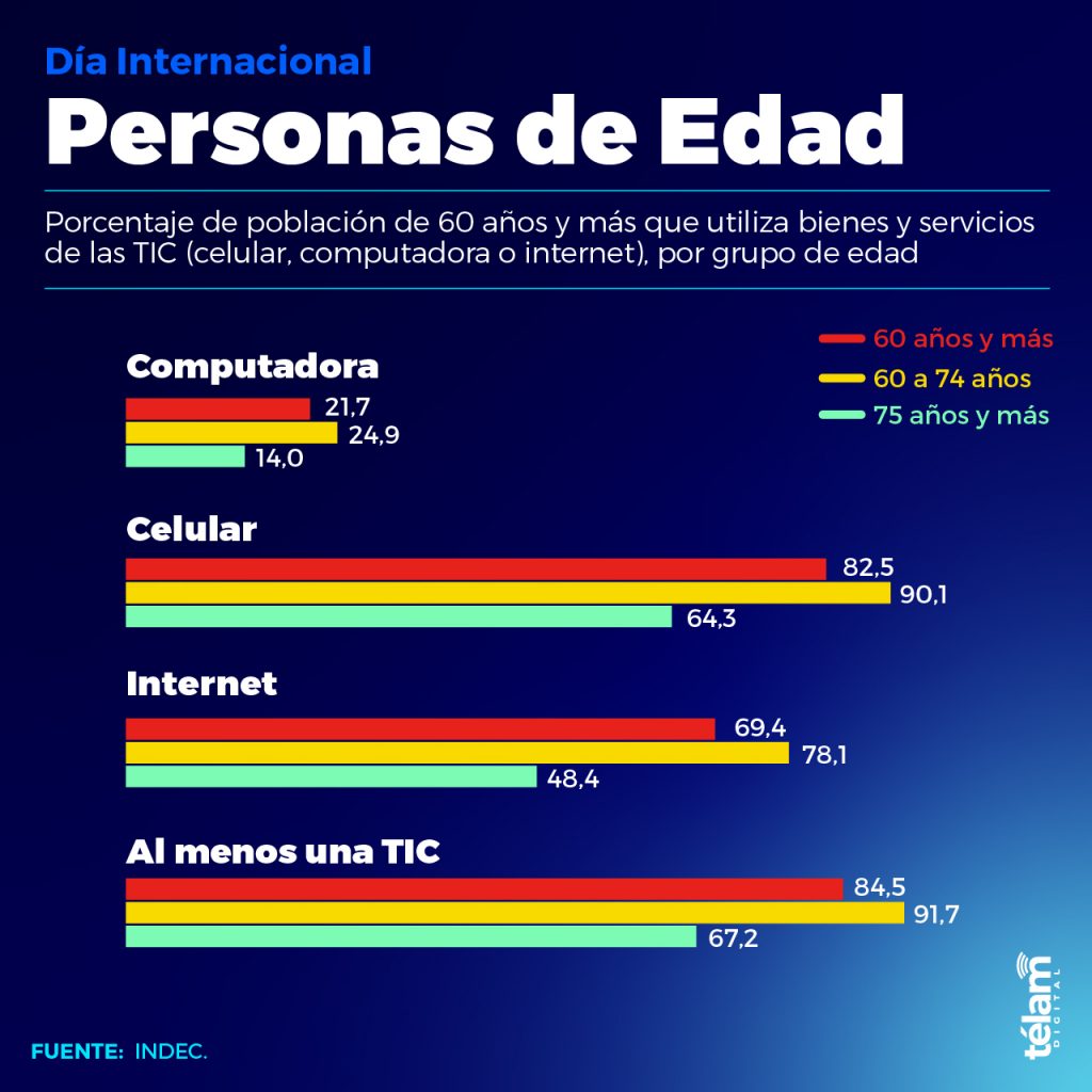 Ochenta y dos de cada cien personas de 60 años y más, utilizan celular; 21 usan computadoras y las mujeres de la misma franja etaria realizan una hora y dieciséis minutos más de trabajo doméstico que los hombres, según el último informe estadístico de personas mayores elaborado por el Indec, en conmemoración del 33º Día Internacional de las Personas de Edad, que se celebra el 1 de octubre.