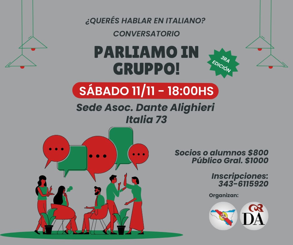 El sábado 11 de noviembre a partir de las 18 horas se realizará un nuevo encuentro de “Parliamo in Gruppo” en la sede de la Dante de Paraná, Italia 73.