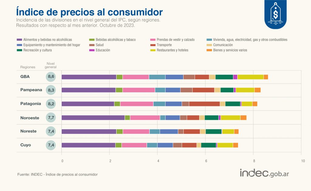 En lo que respecta a las distintas regiones del país, frente a una suba promedio del 8,3% en el índice general de precios a nivel nacional, solo el Gran Buenos Aires -que mide a CABA y el Conurbano- se ubicó por encima en octubre, con un avance de 8,6%.