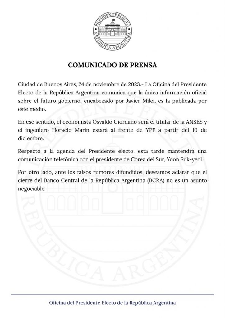 En el comunicado se indicó también que, “ante los falsos rumores difundidos, el cierre del Banco Central no es un asunto negociable” y anunciaron que esta tarde Milei “mantendrá una comunicación telefónica con el presidente de Corea del Sur, Yoon Suk-yeol.