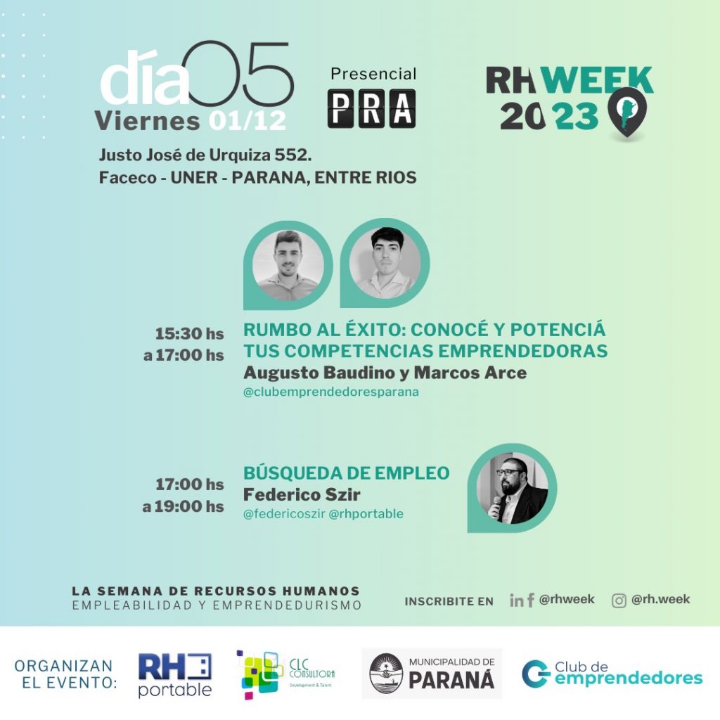 Este viernes 1 de diciembre, el RHWeek llega en forma presencial a Paraná gracias al trabajo articulado entre la Oficina de Empleo de la Municipalidad y el Club de Emprendedores de Paraná con las consultoras RHPortable y CLC Consultora.