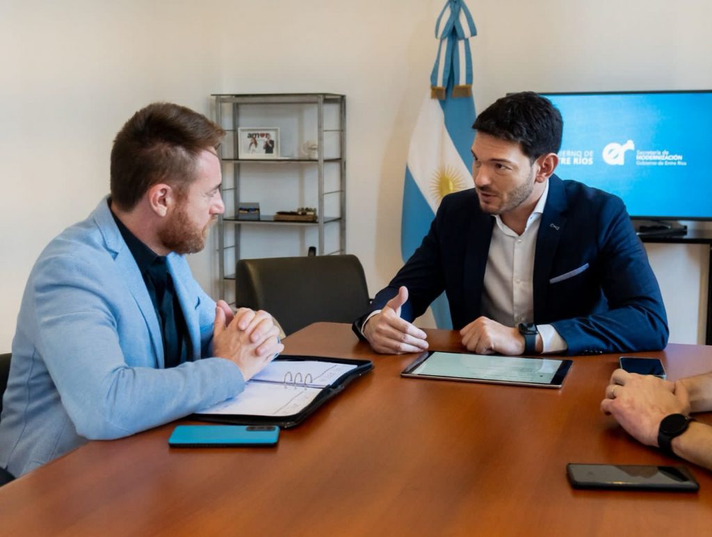 El Secretario de Modernización de la provincia de Entre Ríos, Emanuel Gainza, se reunió con el Decano de la Facultad de Ciencia y Tecnología de la Uader, Juan Pablo Filipuzzi. En el encuentro dialogaron sobre el lanzamiento de una plataforma relacionada a cursos de programación, acerca de la importancia de reactivar los Puntos Digitales y avanzaron en el fortalecimiento del sistema de pasantías para fortalecer el vínculo entre Estado, universidades y el sector privado.