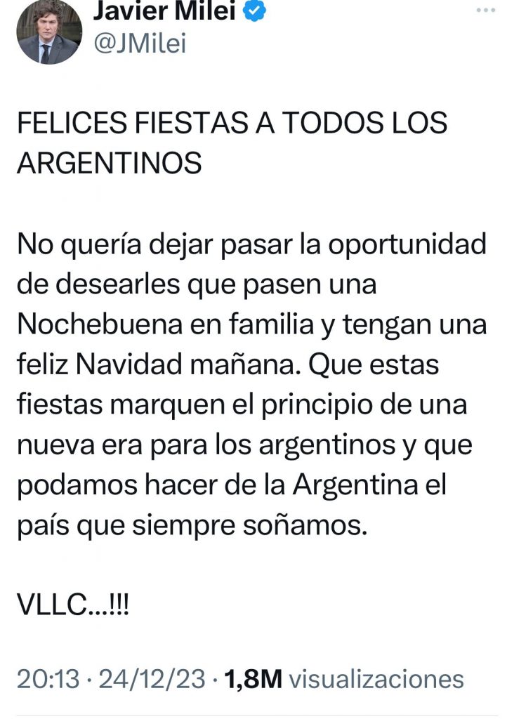 “No quería dejar pasar la oportunidad de desearles que pasen una Nochebuena en familia y tengan una feliz Navidad mañana. Que estas fiestas marquen el principio de una nueva era para los argentinos y que podamos hacer de la Argentina el país que siempre soñamos”, agregó y cerró: “¡Viva la libertad, carajo!”.