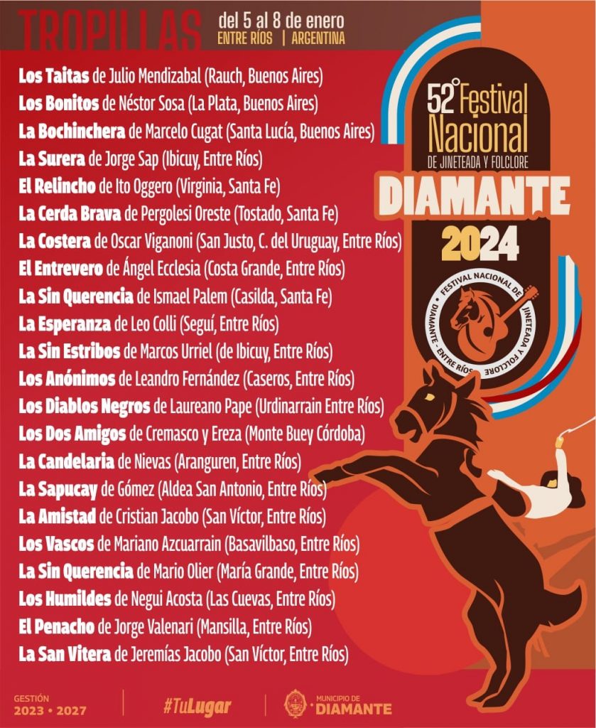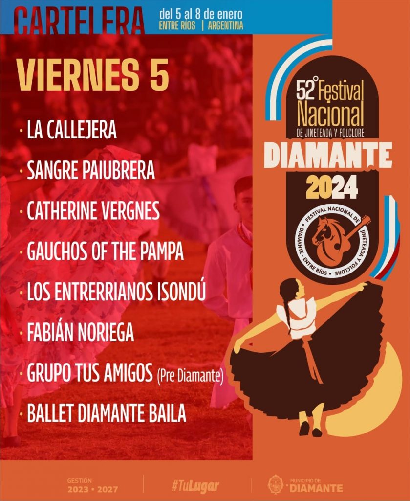 Cabe recordar que las entradas pueden pagarse en hasta tres cuotas sin interés -con algunos bancos- y pueden adquirirse en https://diamante.tike.com.ar/. También los días del evento en el predio o en la Dirección de Cultura local (25 de Mayo y Urquiza). Los valores van desde $1.000 hasta $10.000.