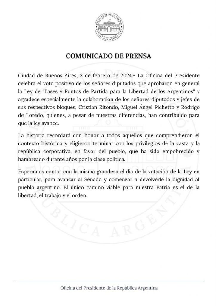 “La Oficina del Presidente celebra el voto positivo de los señores diputados que aprobaron en general la Ley de ‘Bases y Puntos de Partida para la Libertad de los Argentinos’ y agradece especialmente la colaboración de los señores diputados y jefes de sus respectivos bloques, Cristian Ritondo, Miguel Ángel Pichetto y Rodrigo de Loredo, quienes, a pesar de nuestras diferencias, han contribuido para que la ley avance”, señaló un comunicado de prensa.