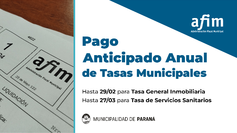 A través de la Administración Fiscal Municipal (AFIM), se comunica que se encuentra vigente el pago anual adelantado de tasas correspondientes a los servicios municipales de recolección de residuos, provisión de agua potable y desagües cloacales.