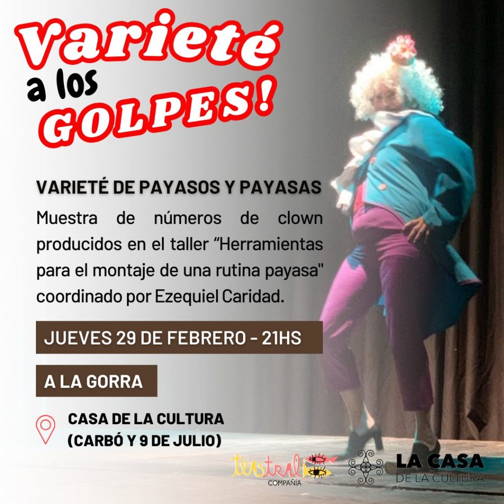 ¡Varieté a los golpes!, propuesta de teatro de variedades de payasos y payasas, se realizará este jueves 29 de febrero a las 21 en Casa de la Cultura (Carbó y 9 de Julio) con entrada libre y a la gorra.