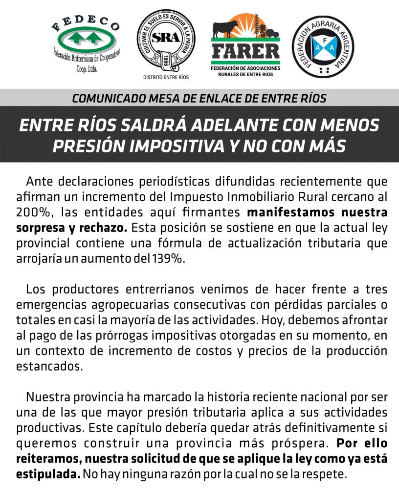La Federación Entrerriana de Cooperativas, el distrito Entre Ríos de la Federación Agraria, Farer y la Federación Agraria emitieron este miércoles un comunicado conjunto en el que rechazaron un posible incremento cercano al 200% del Impuesto Inmobiliario Rural.