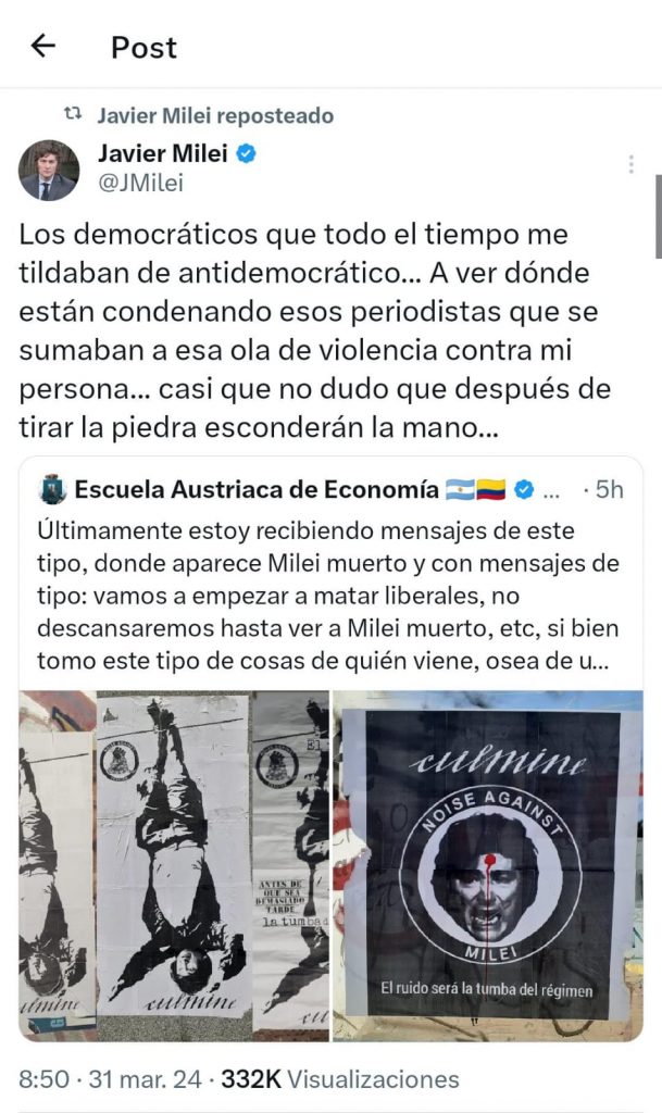 Todo esto se dio por un posteo de la cuenta “Escuela Austríaca de Economía”, que denunciaba recibir “mensajes de este tipo, donde aparece Milei muerto o con mensajes de tipo: vamos a matar liberales, no descansaremos hasta ver a Milei muerto, etc. Si bien tomo este tipo de cosas de quien viene, o sea de unos imbéciles, a veces toca tener cierto reparo”.