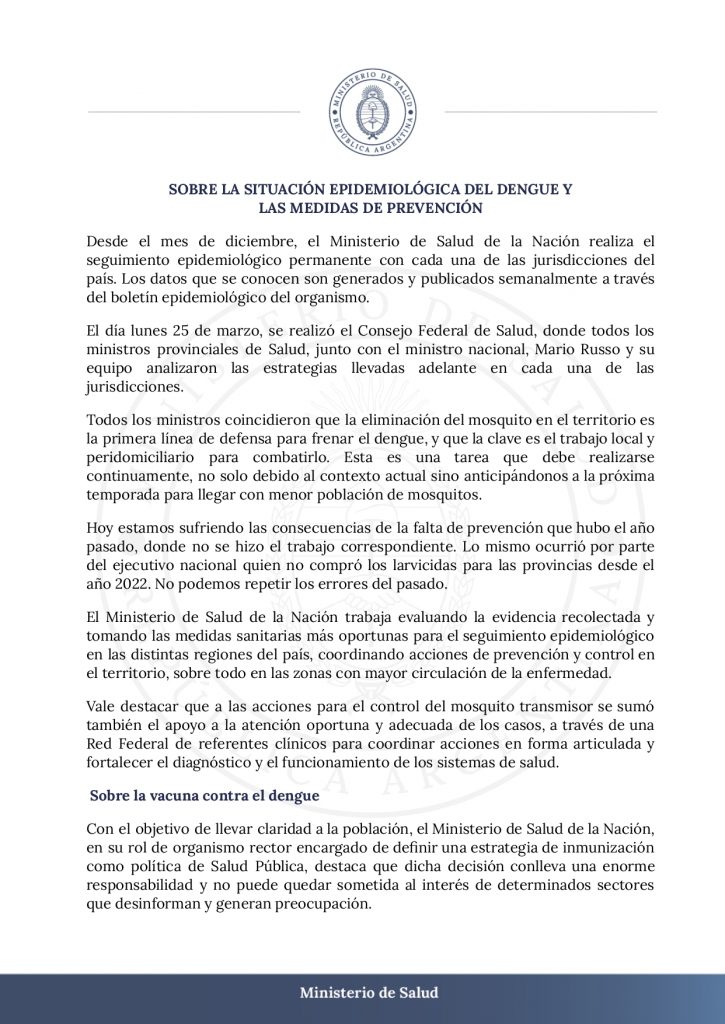 “Estamos sufriendo las consecuencias de la falta de prevención que hubo el año pasado, donde no se hizo el trabajo correspondiente”, aseguraron. “Lo mismo ocurrió por parte del ejecutivo nacional quien no compró los larvicidas para las provincias desde el año 2022. No podemos repetir los errores del pasado”, denunciaron.