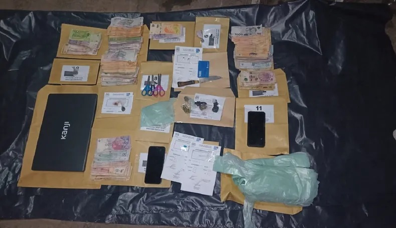 En los registros domiciliarios, se encontraron diversos elementos de interés para la causa, así como sustancia estupefaciente Clorhidrato de Cocaína y Marihuana, en dosis listas para ser comercializadas; dinero en efectivo (en moneda de curso legal); telefonía móvil; elementos informáticos; elementos de corte, fraccionamiento y estiramiento de sustancias estupefacientes.
