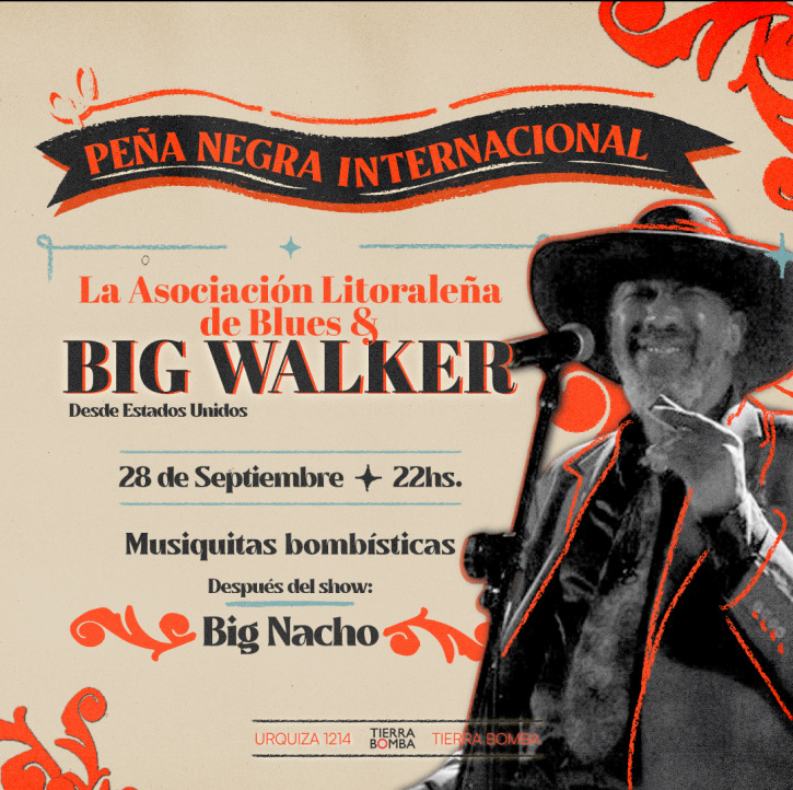 El sábado 28 de septiembre desde las 22 en Tierra Bomba (Urquiza 1214) se realizará la Peña Negra Internacional. Se presentará Big Walker con la Asociación Litoraleña de Blues. Entradas a la venta a través de passline.