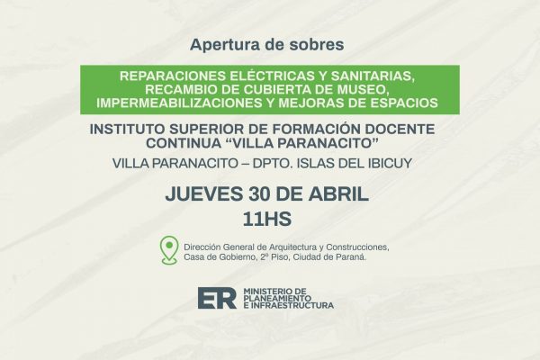 Por Editor27 abril, 2026El Gobierno de Entre Ríos llevará adelante la apertura de sobres para la ejecución de obras edilicias y sanitarias del Instituto Superior de...