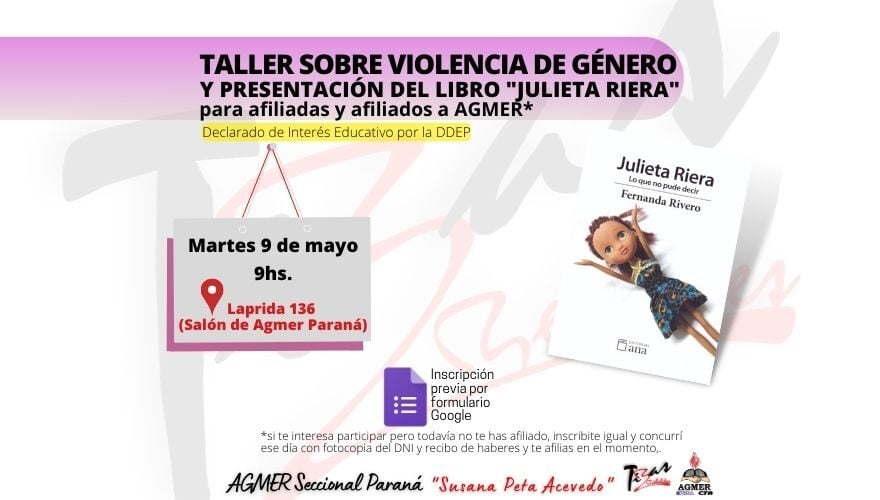 Este martes 9 de mayo a partir de las 9:00 de la mañana en la Seccional, Laprida 136 se realizará un taller sobre violencia de género junto a la presentación del libro «Julieta Riera. Lo que no pude decir» de Fernanda Rivero.
