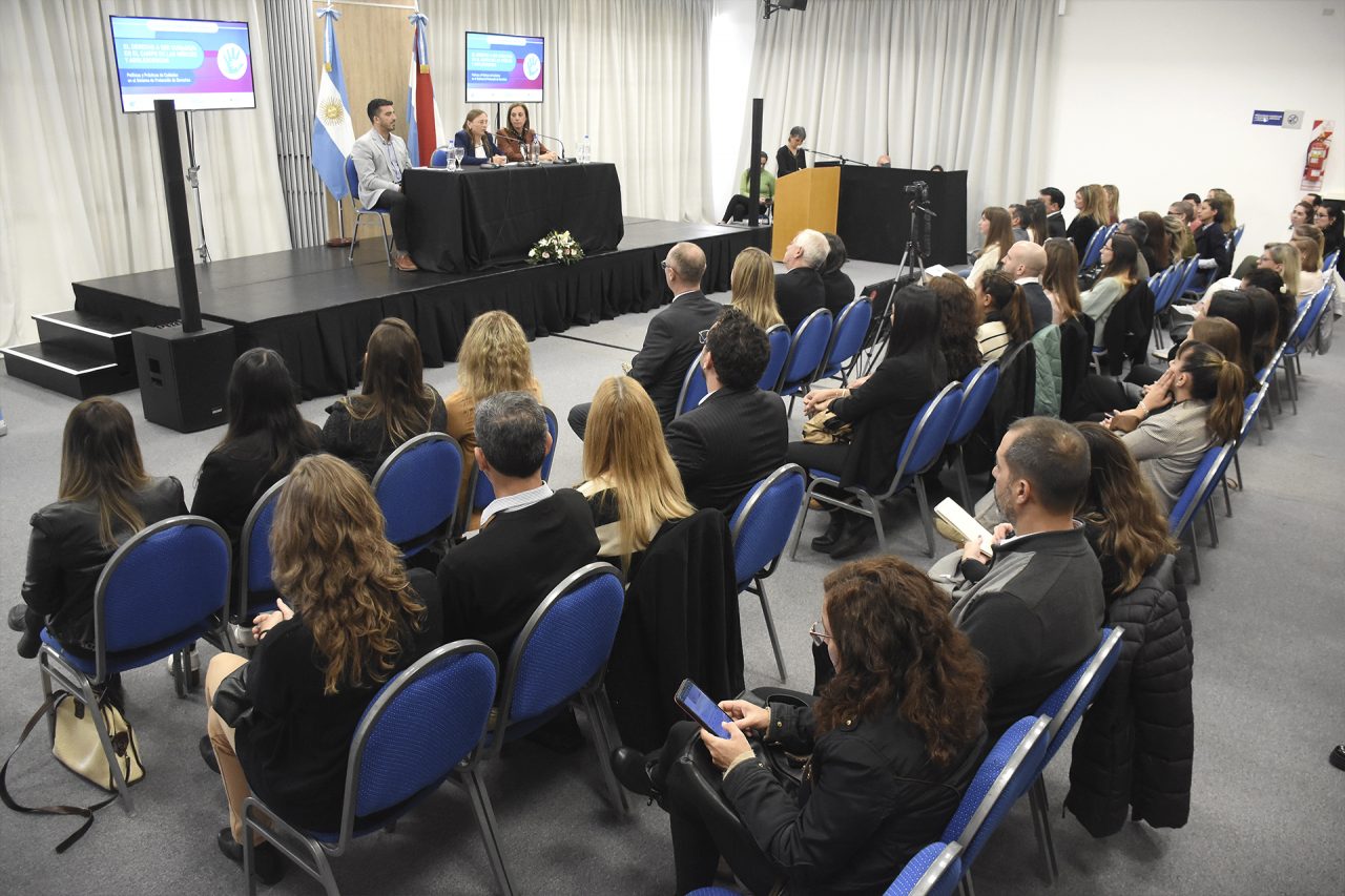 La ministra de Desarrollo Social, Marisa Paira; el presidente del Copnaf, Gabriel Leconte, y la decana de la Facultad de Humanidades Artes y Ciencias Sociales, María Gracia Benedetti, presentaron el Ciclo de formación continua destinado a operadores del campo de la niñez, adolescencia y familia del Sistema de Protección de Derechos provincial.