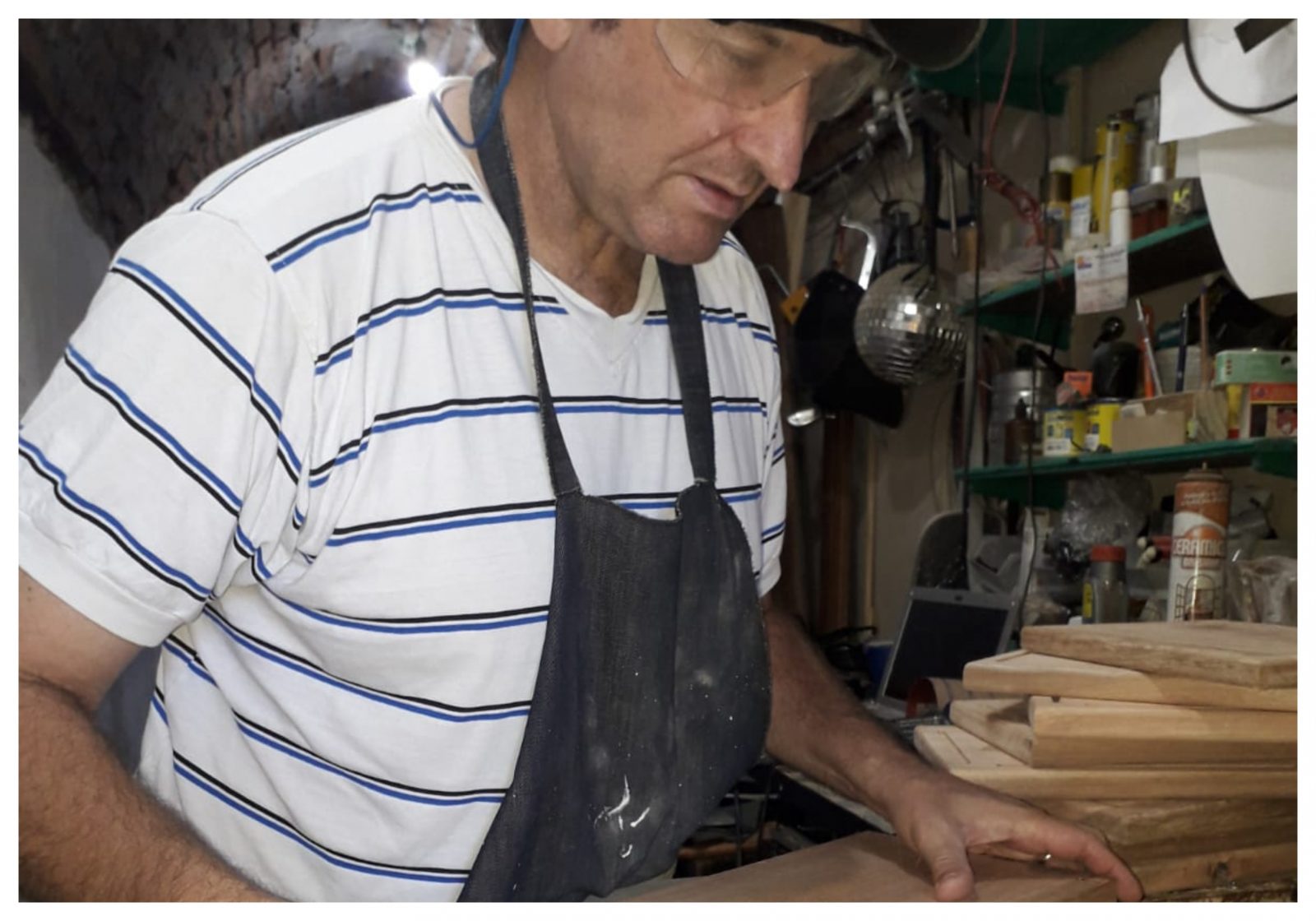 Alfredo tiene 50 años y se desempeña solo en su taller, con la colaboración de María Eugenia Sarli en la comunicación y difusión de sus productos.