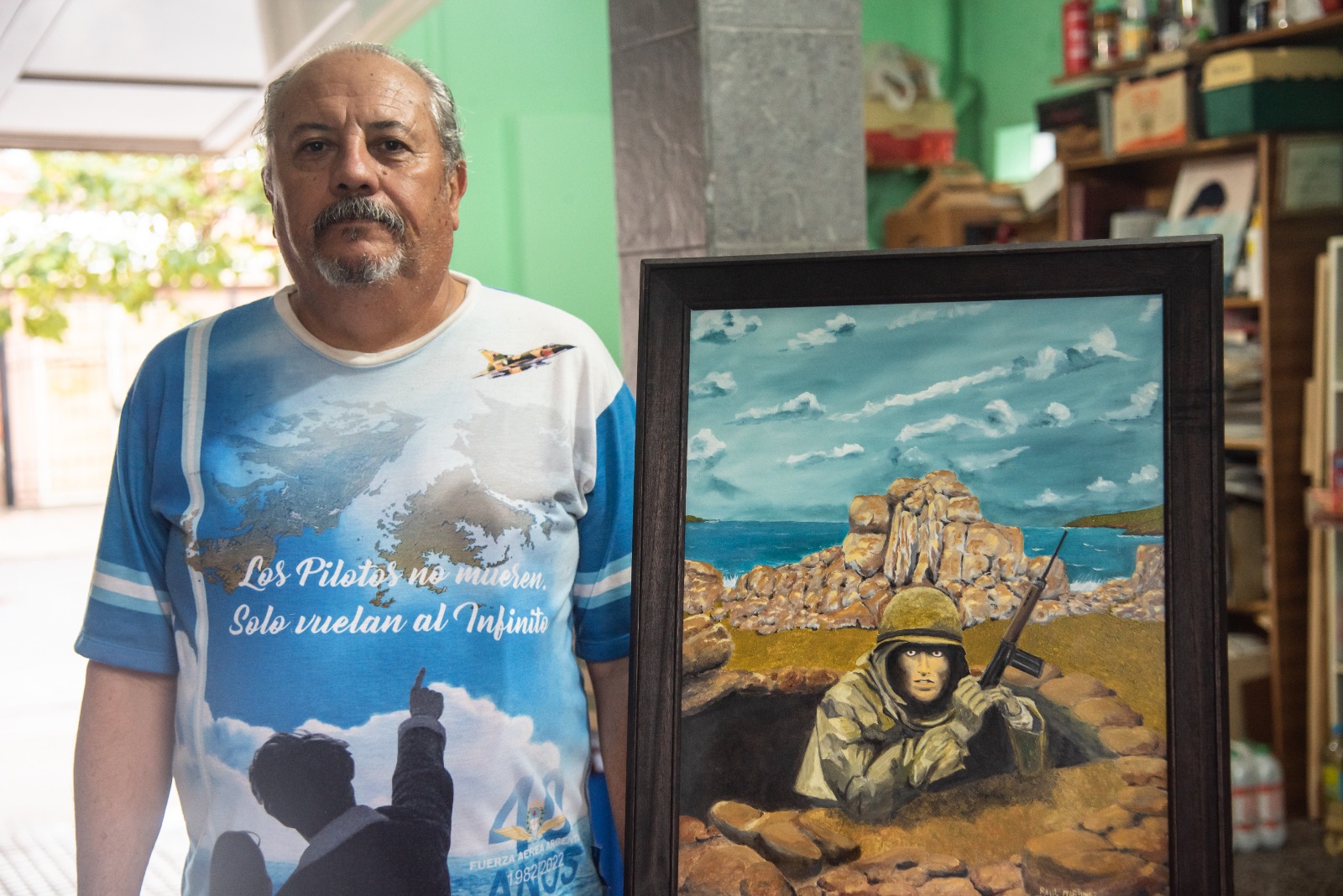 El entrevistado destacó la existencia de un cuadro que considera de relevante significación. Se trata de una fotografía que halló en internet, pero que al estar en blanco y negro, debió agregarle color y fondo. “Significa mucho porque yo estaba preparado para lo que se vino; egresé en 1976 y en 1981 empecé a volar el Pucará como mecánico a bordo. Pero hubo soldados que fueron llevados a la isla sin darles demasiadas explicaciones. Me siento identificado porque también estuve en un pozo como el soldado de la foto, pasé hambre y frío. Él no tendría que haber estado ahí, deberíamos haber ido los que estábamos preparados. Tampoco cuestiono la decisión, pero no sé si Argentina estaba en condiciones de entrar en guerra en ese momento”, aclaró acerca de su concurrencia al conflicto bélico, que igualmente los tomó por sorpresa.