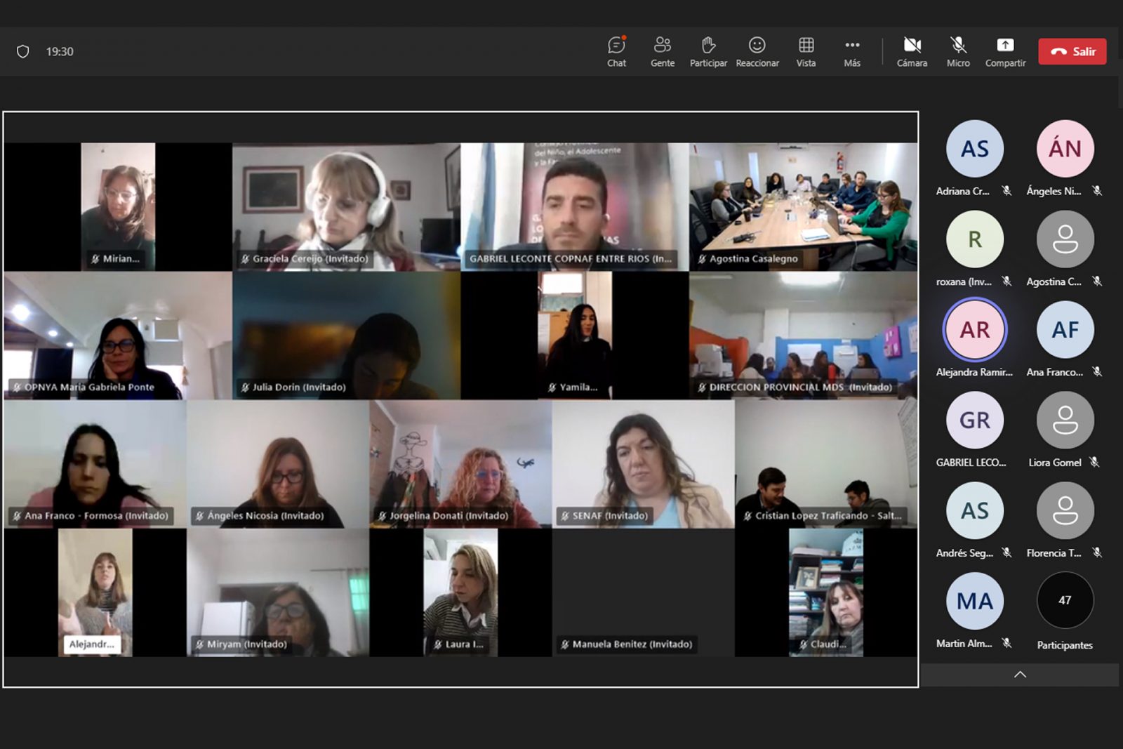 El encuentro virtual donde disertaron el presidente y la vicepresidenta del Consejo Provincial del Niño, el Adolescente, y la Familia (Copnaf), Gabriel Leconte y Alejandra Ramírez respectivamente, contó con la presencia de la defensora de los Derechos de las Niñas, Niños y Adolescentes, Marisa Grahan; el defensor adjunto, Juan Facundo Hernández, y la directora de Fortalecimiento del Sistema de Promoción y Protección, Alicia Guerrero Zarza.