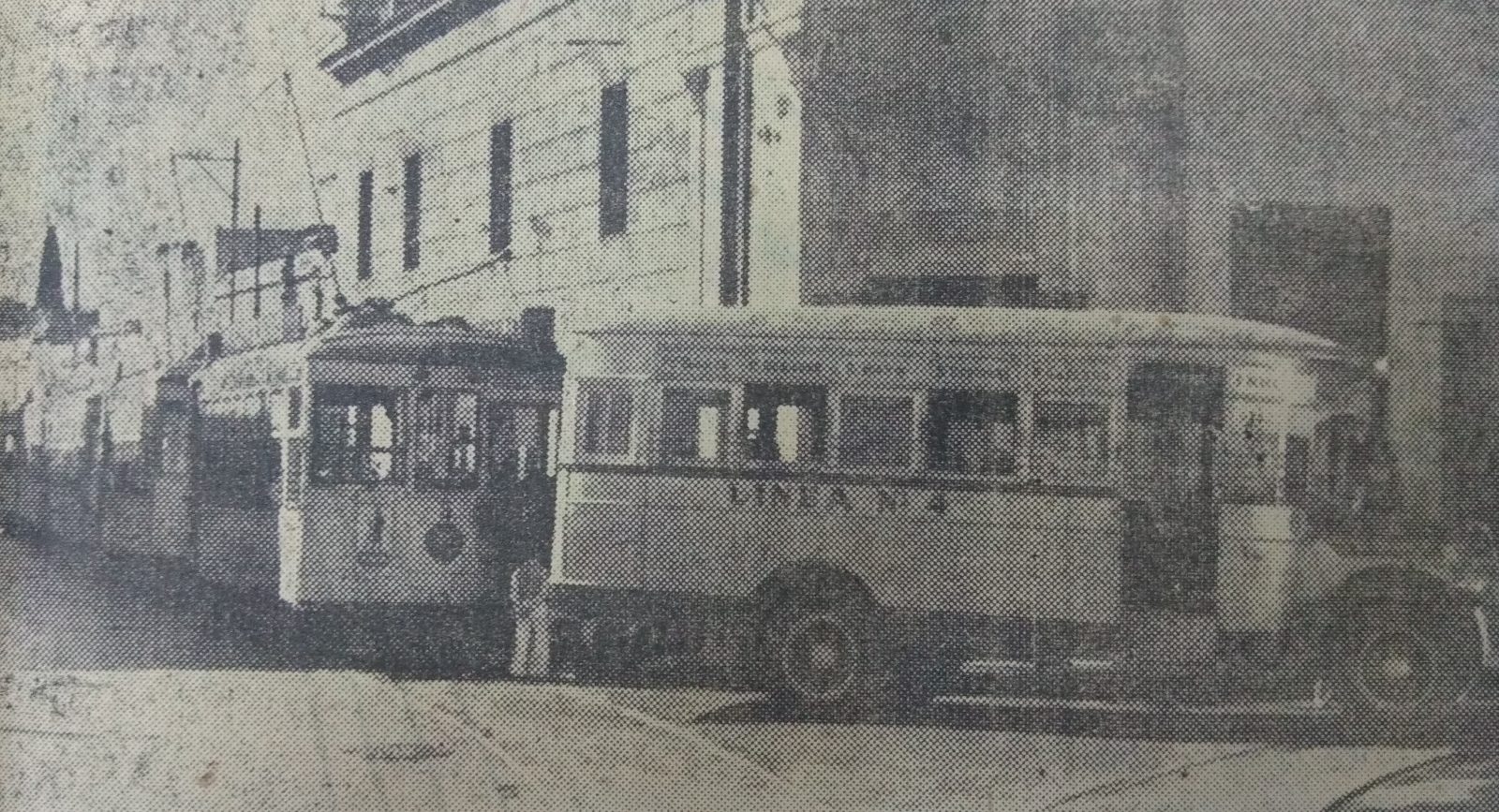 La foto muestra a los herederos de esos medios de transporte: publicada en febrero de 1948, se advierten en la composición gráfica los primeros colectivos.