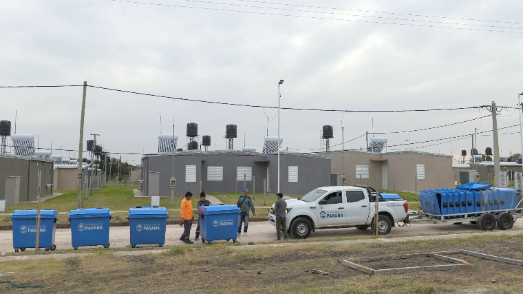 La Municipalidad colocó 18 contenedores de recolección trasera en las calles del nuevo barrio 500 Viviendas del IAPV, en la zona sur de la ciudad de Paraná. Este lunes se realizó el primer servicio de recolección a cargo de la Unidad Municipal Central, servicio que será de lunes a sábado.