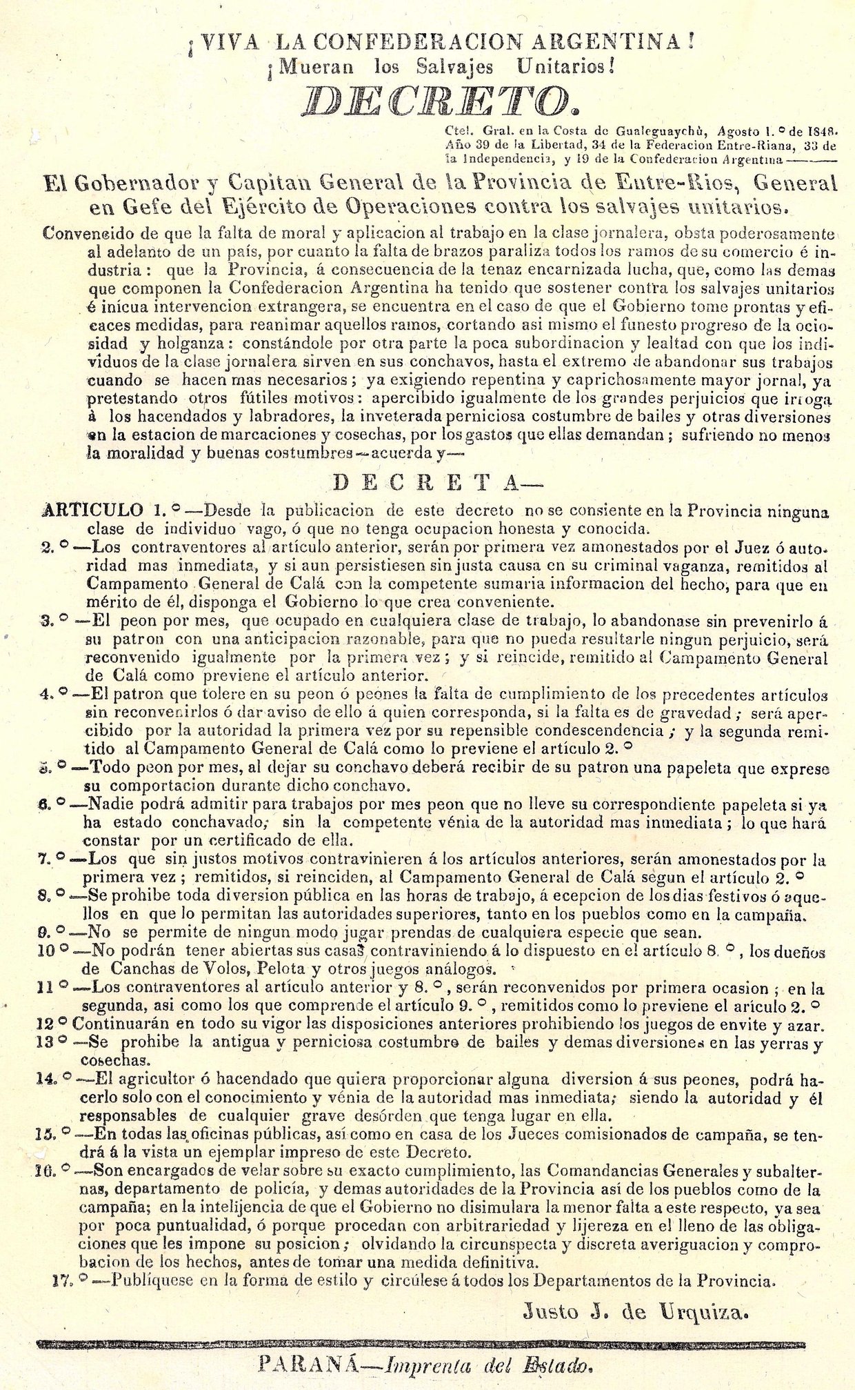 Urquiza, el 1º de agosto de 1848, dictó un decreto que en su artículo 1º expresaba que en adelante no se consentiría en la provincia “ninguna clase de individuo vago, o que no tenga ocupación honesta y conocida”. Los contraventores serían sometidos a proceso y remitidos al comandante general de Cala. Igual suerte corría el peón que abandonase el trabajo sin prevenirlo a su patrón con una anticipación razonable y el patrón que le tolerase la falta sin prevenirlo o informarle a la autoridad, prohibía las diversiones públicas en las horas de trabajo a excepción de los festivos; que se jugaran prendas de cualquier clase; que estuvieran abiertas, dentro de ese horario las canchas de bolos, pelotas y otros juegos. También prohibía “la antigua perniciosa costumbre de bailes y demás diversiones en las yerras y cosechas”. El agricultor o hacendado que quisiera proporcionar fiestas debía tener la venia de la autoridad más inmediata.