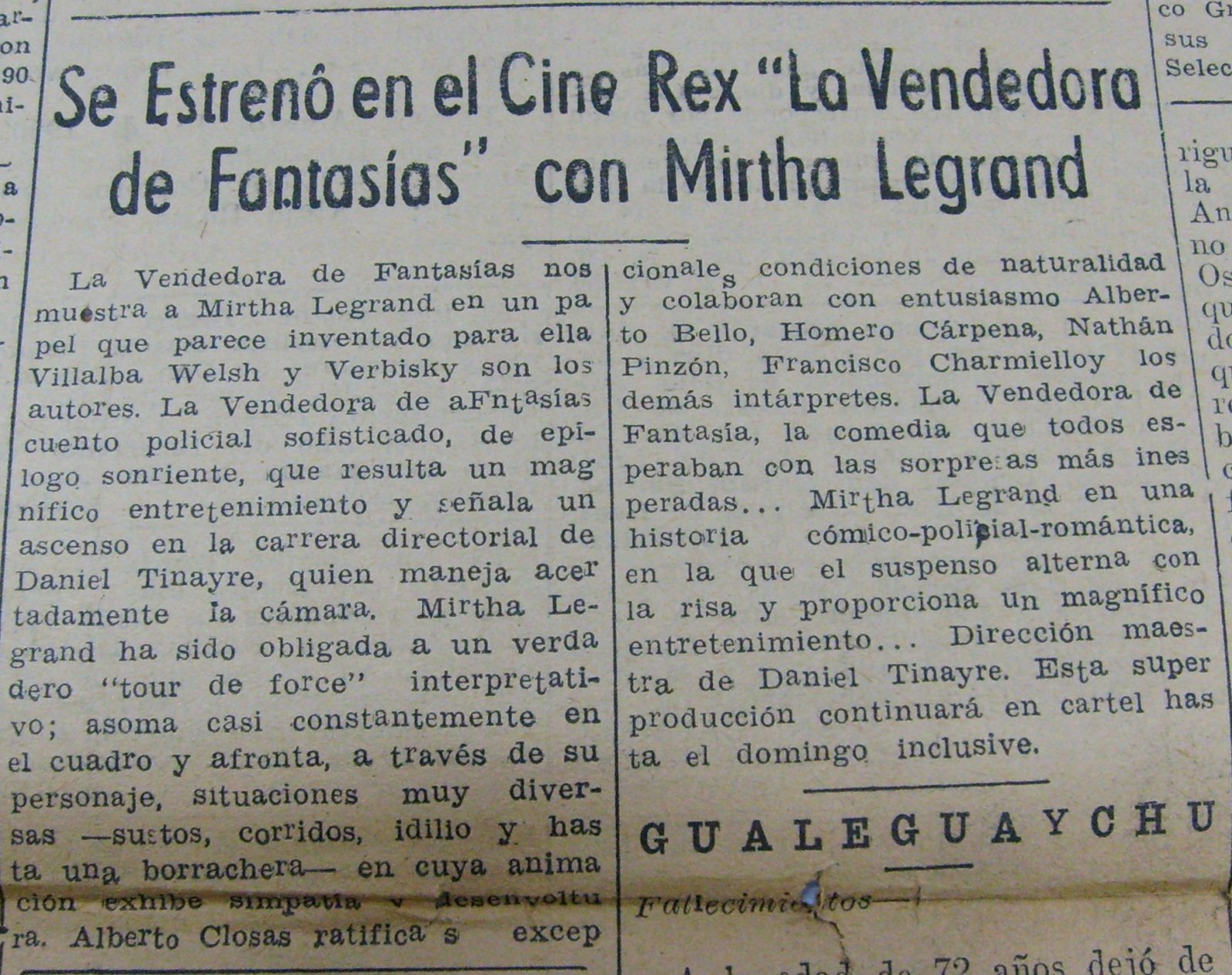 El diario La Acción de Paraná informa sobre el estreno de la película “La vendedora de Fantasías” con Mirtha Legrand, “en un papel que parece inventado para ella”, consigna el diario y agrega que se trata de “un cuento policial sofisticado, de epílogo sonriente, que resulta un magnífico entretenimiento y señala un ascenso en la carrera directorial de Marcelo Tinayre…”.