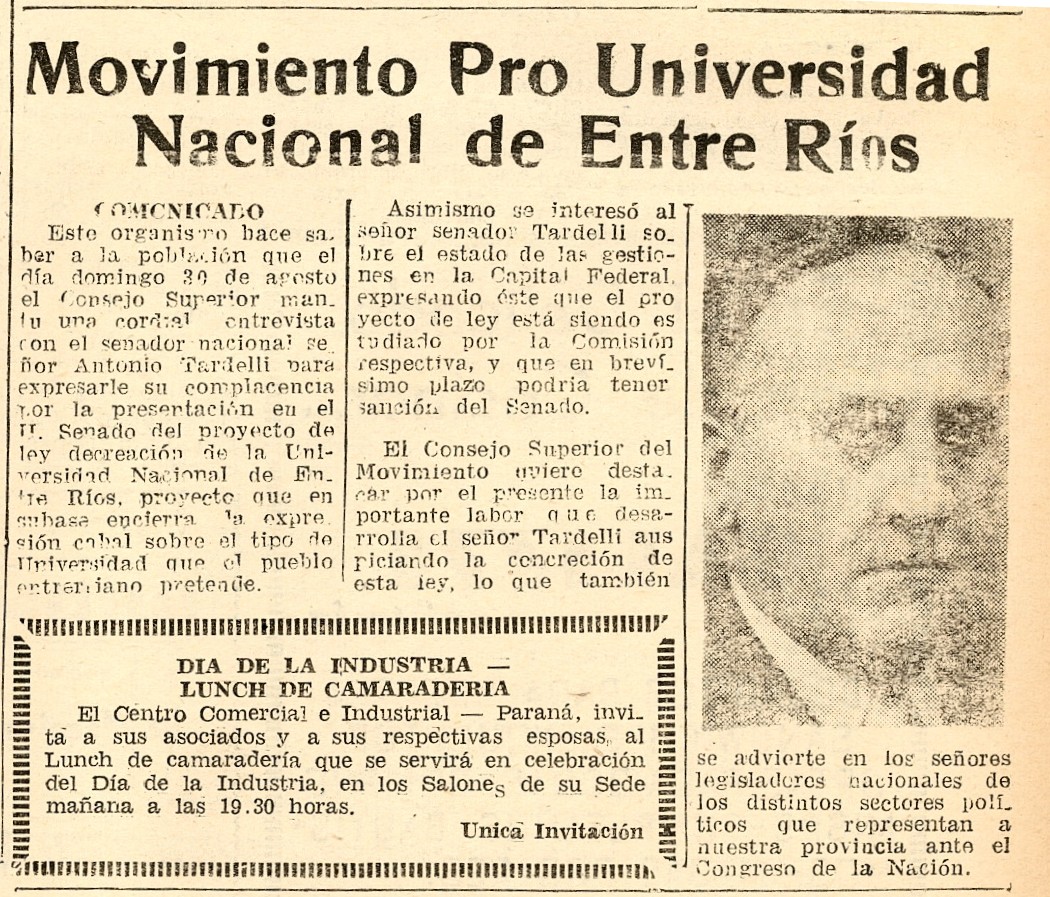 El Movimiento pro Universidad de Entre Ríos informaba sobre las gestiones realizadas para impulsar la creación de la Universidad Nacional de Entre Ríos, que era una sentida aspiración de los entrerrianos para revertir la emigración de la juventud a cursar estudios superiores a otras provincias. Le expresaba su agradecimiento al senador nacional Antonio Tardelli por la presentación del proyecto ante el Congreso de la Nación. El proyecto debió esperar casi una década ya que recién en mayo de 1973 se sancionó la ley de creación.