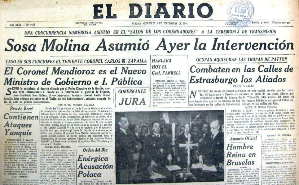 El general de brigada José Humberto Sosa Molina asume la intervención del gobierno de Entre Ríos, dispuesta por decreto del presidente Farrell, tras la polémica gestión del interventor Carlos María Zavalla.