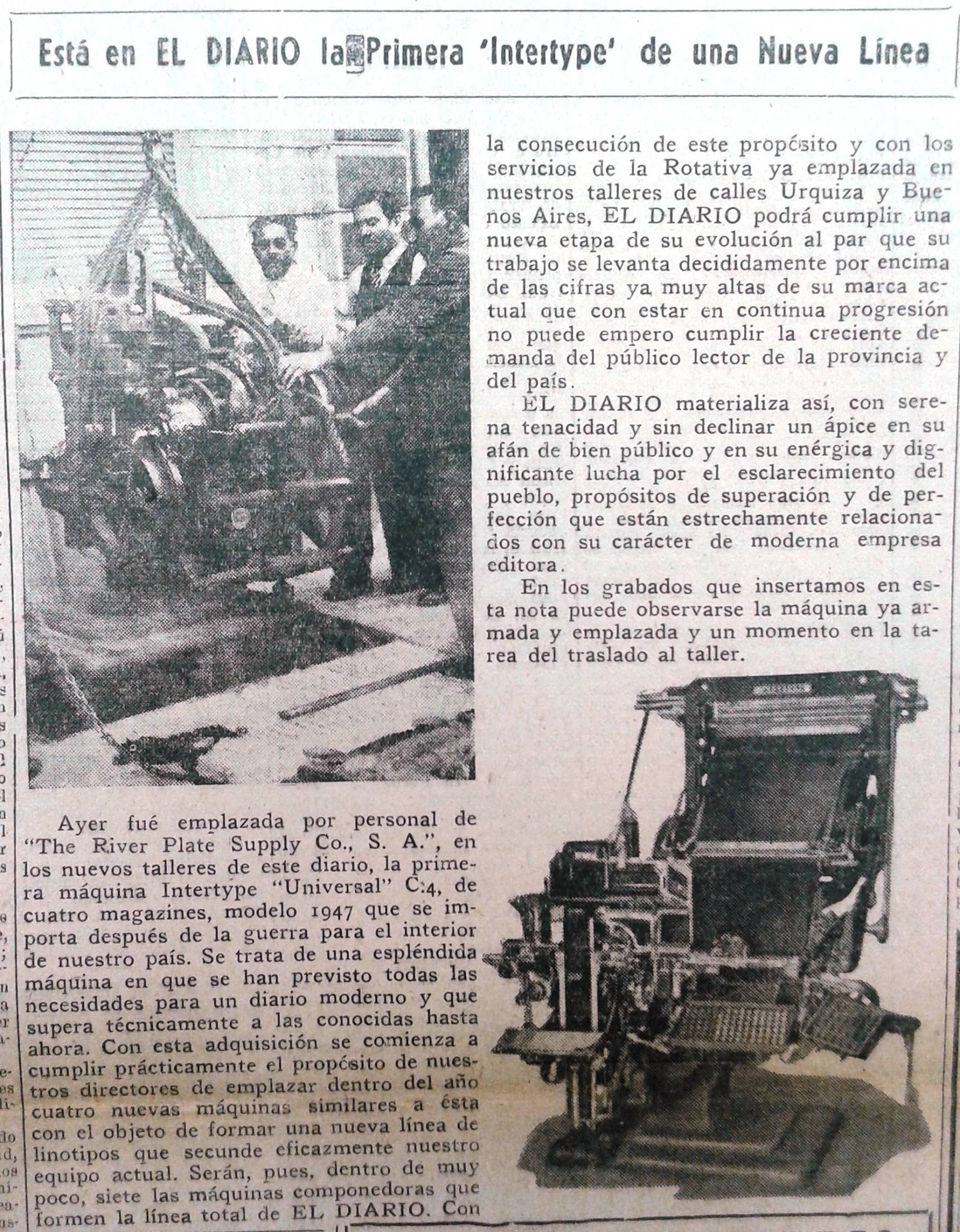 El Diario de Paraná anunciaba la puesta en marcha de la recientemente adquirida impresora Intertype “Universal”, la primera que se importaba al país después de la Guerra europea. “Se trata de una espléndida máquina – dice la crónica – en que se han previsto todas las necesidades para un diario moderno y que supera técnicamente lo conocido hasta ahora (…)”.