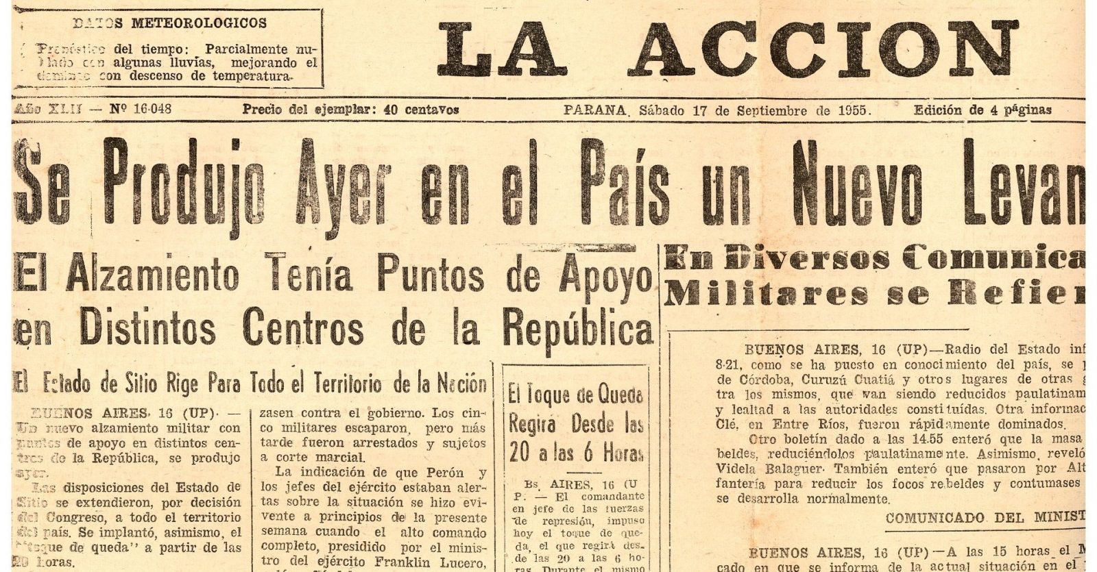 El 16 de septiembre de 1955 un sector de las fuerzas armadas avalada por grupos civiles provocó un golpe de estado autodenominado “Revolución Libertadora”. Tras una transición en la que se sucedieron las negociaciones, “el 23 de setiembre de 1955 el General Lonardi juraba como presidente de facto. Duró poco en su cargo ya que el 13 de noviembre fue desplazado y reemplazado por el nuevo jefe del Estado Mayor del Ejército, General Pedro Eugenio Aramburu.