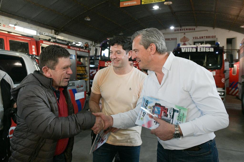 En Villa Elisa, se reunió con dirigentes deportivos, compartió una caminata con vecinos y visitó la sede de Bomberos Voluntarios, donde habló con el presidente de la institución, Leandro Arribalzaga.