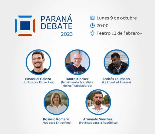 Participarán los cinco candidatos: Emanuel Gainza (Juntos por Entre Ríos),  Dante Klocker (Movimiento Socialista de los Trabajadores –MST-), Andrés Laumann (La Libertad Avanza), Rosario Romero (Más para Entre Ríos) y Armando Sánchez (Políticas para la República).