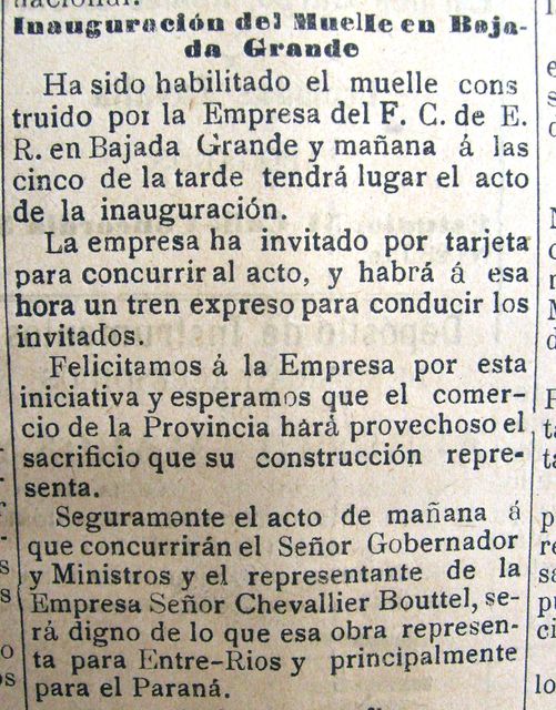 El 16 de octubre de 1896 la prensa local informa sobre la habilitación del muelle construido por la empresa Ferrocarriles de Entre Ríos en Bajada Grande. La inauguración está prevista para el día siguiente con la presencia del gobernador, ministros y el representante de la empresa Chevallier Bouttel.