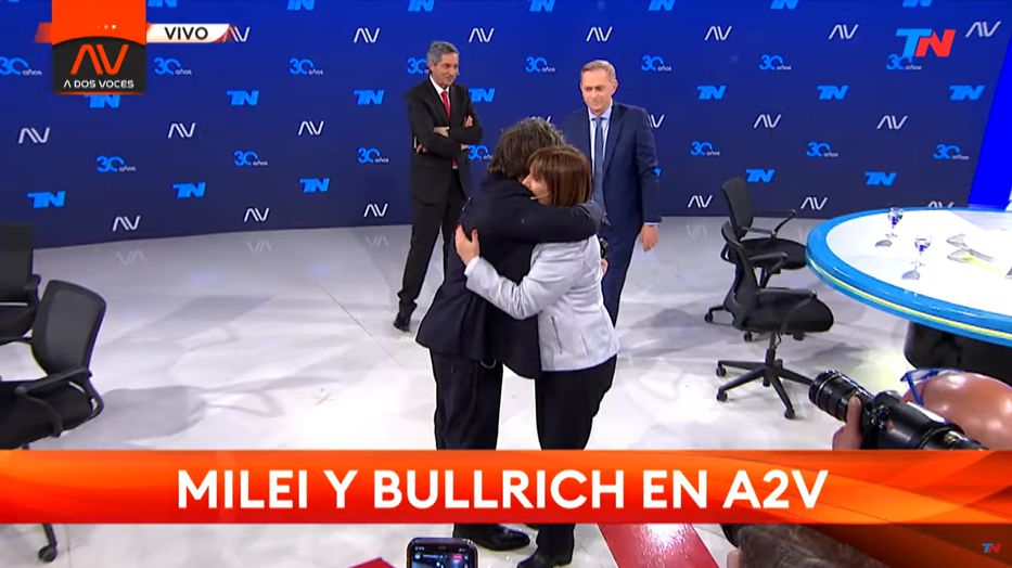 El abrazo entre ambos se dio luego que los conductores de A Dos Voces (TN) se lo pidieran. Es la primera vez que se muestran en público, tras el anuncio de Bullrich este miércoles en el que demostró su apoyo al liberal tras compartir una cena el martes con él y con Mauricio Macri.