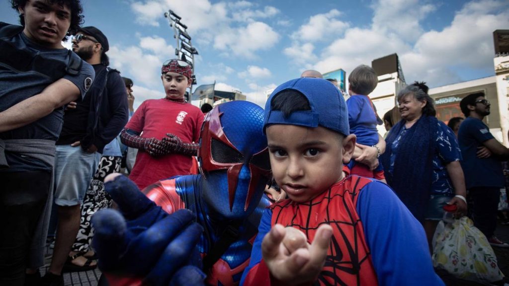 Un abuelo, que llegó disfrazado cargando a su nieto sobre los hombros, relató: “Vinimos desde Mendoza con mi nieto y mi hija, porque a él (señalando al chico) le encanta el hombre araña y yo como abuelo le hago la segunda en todas”.