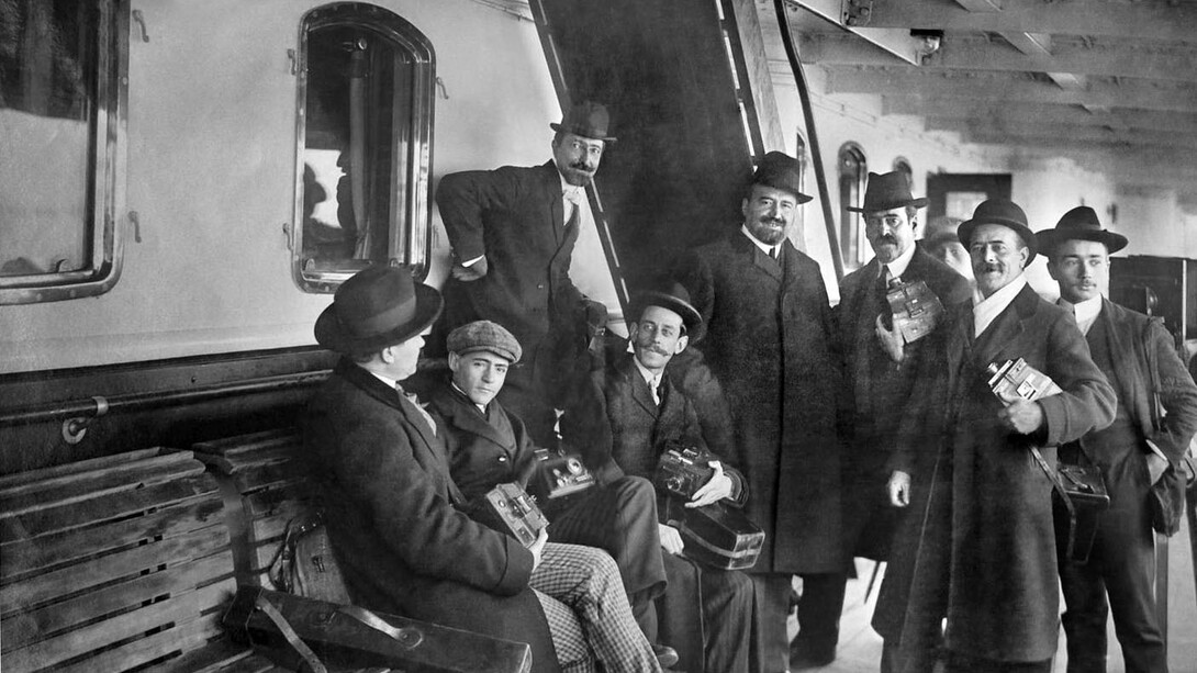 El escritor, y político republicano español Vicente Blasco Ibañez -centro de la imagen, con barba y bigotes- llega a Buenos Aires, en 1909. Ese año visitó Paraná, donde brindó dos conferencias.