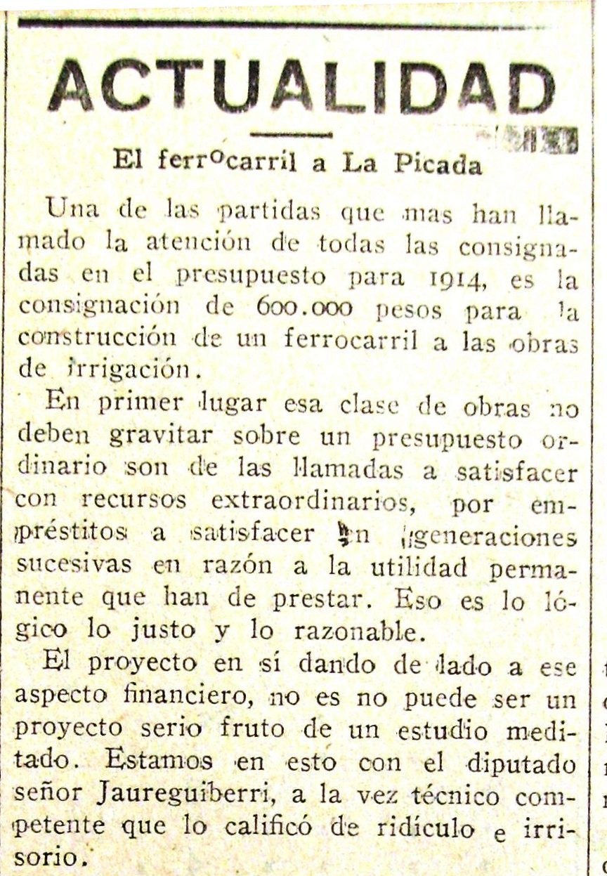 El diario La Acción de Paraná anunciaba el proyecto de construcción, con inclusión de una partida presupuestaria, de un ferrocarril a las obras de irrigación recientemente inauguradas en la zona de La Picada, departamento Paraná. El diario cuestionaba el proyecto por “ridículo e irrisorio (…), un gran juguete de niños grandes que entretienen sus ocios jugando al riel a costa de los intereses de la provincia”