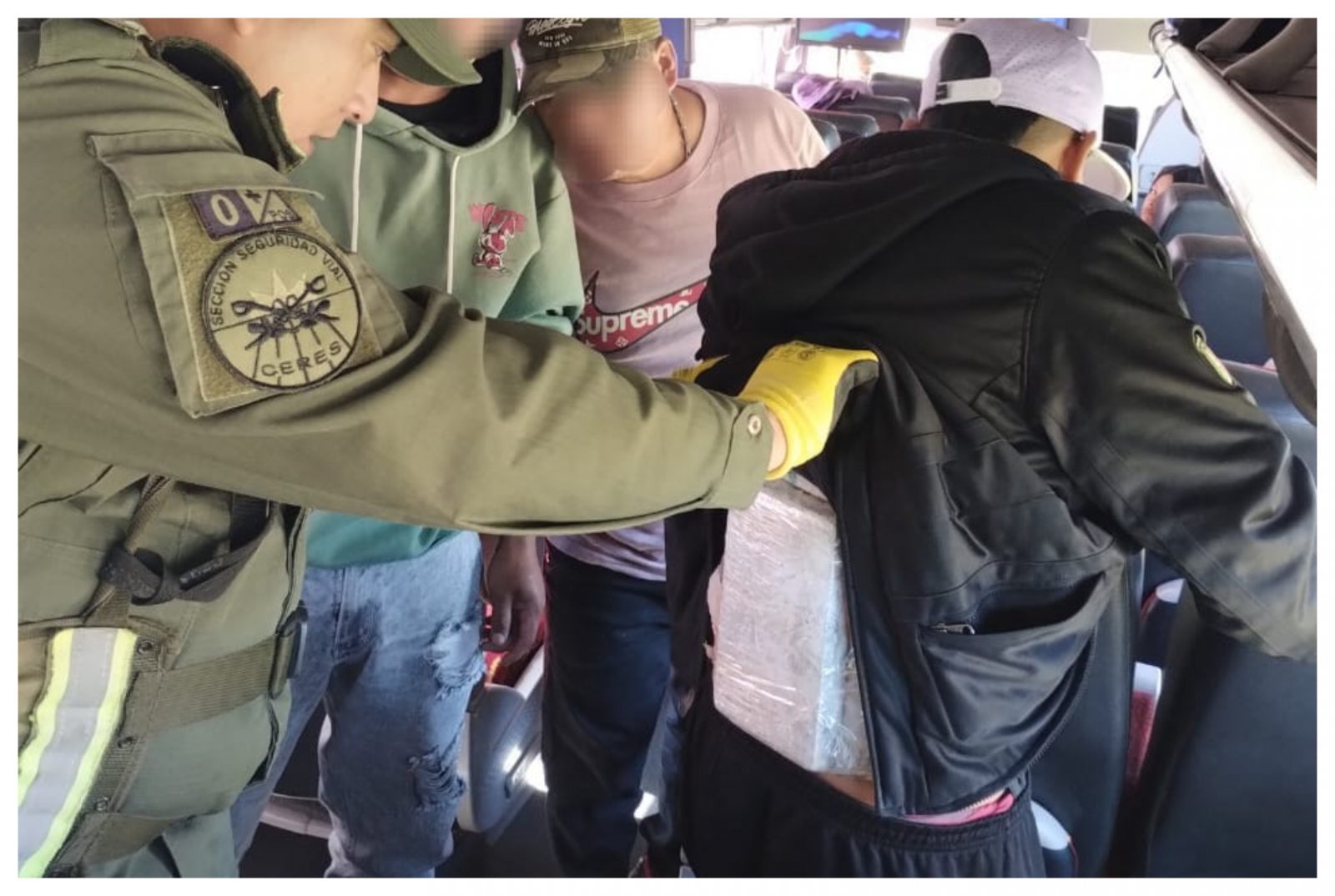 Al momento de la inspección de la parte superior del rodado, los funcionarios constataron que un ciudadano domiciliado en Alto Comedero (Jujuy) trasladaba de forma oculta en la espalda (debajo de la vestimenta) un paquete envuelto con cinta de embalar y un repasador, con una sustancia blancuzca.