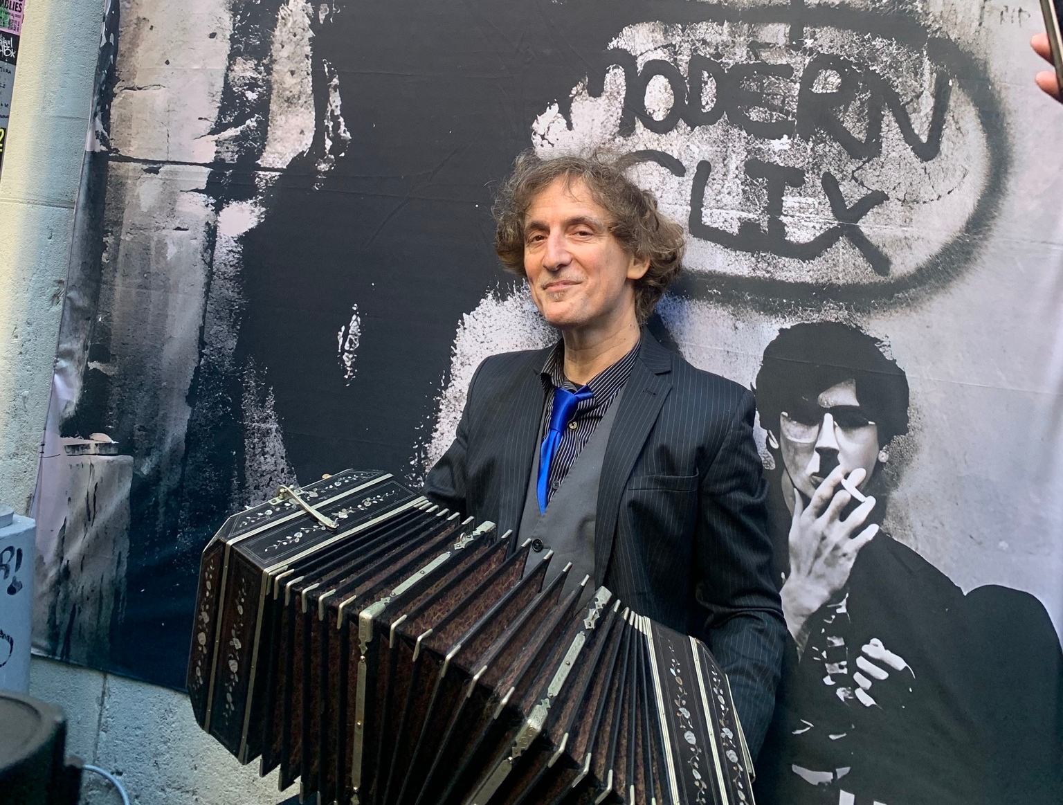Silva retomó los palillos y yo regresé al bandoneón, hasta alcanzar el grand finale con “De mí”. Por entonces, Mariano también subió al palco, loco de felicidad como todos y todas, haciendo registros celulares para la posteridad. “No te olvides de mi, porque sé que te puedo estimular”, cantó Kiuge por el micrófono, destilando un momento épico e inolvidable, como se dice. Hubo saludos, abrazos, fotos y transmisiones dignas de la inmediatez millennial, antes de refugiarnos otra vez en el Mostrador. En la breve caminata, antes de dar la vueltita por Cortland Alley, Cintia La Arquitecta me eternizó delante de la portada. Todo transpirado, muy contento, con mi bandoneón a cuestas…¡No me la iba a perder!
