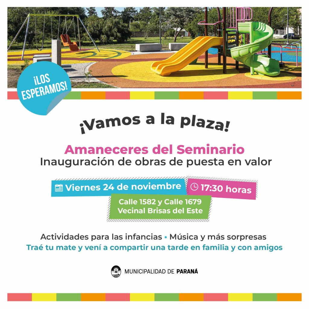 Será este viernes 24 de noviembre, desde las 17.30 hs. Habrá actividades para las infancias , música y sorpresas. El Municipio invita a la comunidad a acercarse al renovado espacio público, ubicado en calles 1582 y 1679, en la Vecinal Brisas del Este.