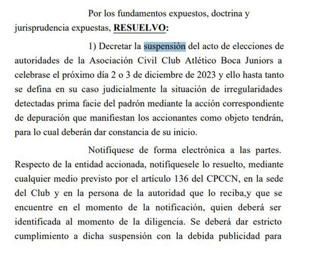 “Resuelvo decretar la suspensión del acto de elecciones de autoridades de la Asociación Civil Club Atlético Boca Juniors a celebrase el próximo día 2 o 3 de diciembre de 2023 y ello hasta tanto se defina en su caso judicialmente la situación de irregularidades detectadas prima facie del padrón mediante la acción correspondiente de depuración que manifiestan los accionantes como objeto tendrán, para lo cual deberán dar constancia de su inicio”, establece el fallo.