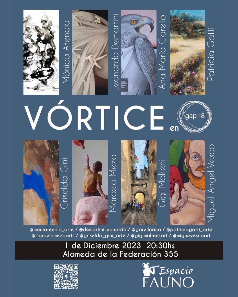 Este Vórtice creativo gira con la energía de los ocho artistas que lo conforman: Mónica Atencio (tintas y acuarelas), Leonardo Demartini (grafitos), Ana María Garello (dibujos), Patricia Gatti (acrílicos), Griselda Gini (abstracciones), Marcelo Meza (cerámicas patinadas), Gigi Molteni (acuarelas) y Miguel Ángel Vesco (acrílicos).