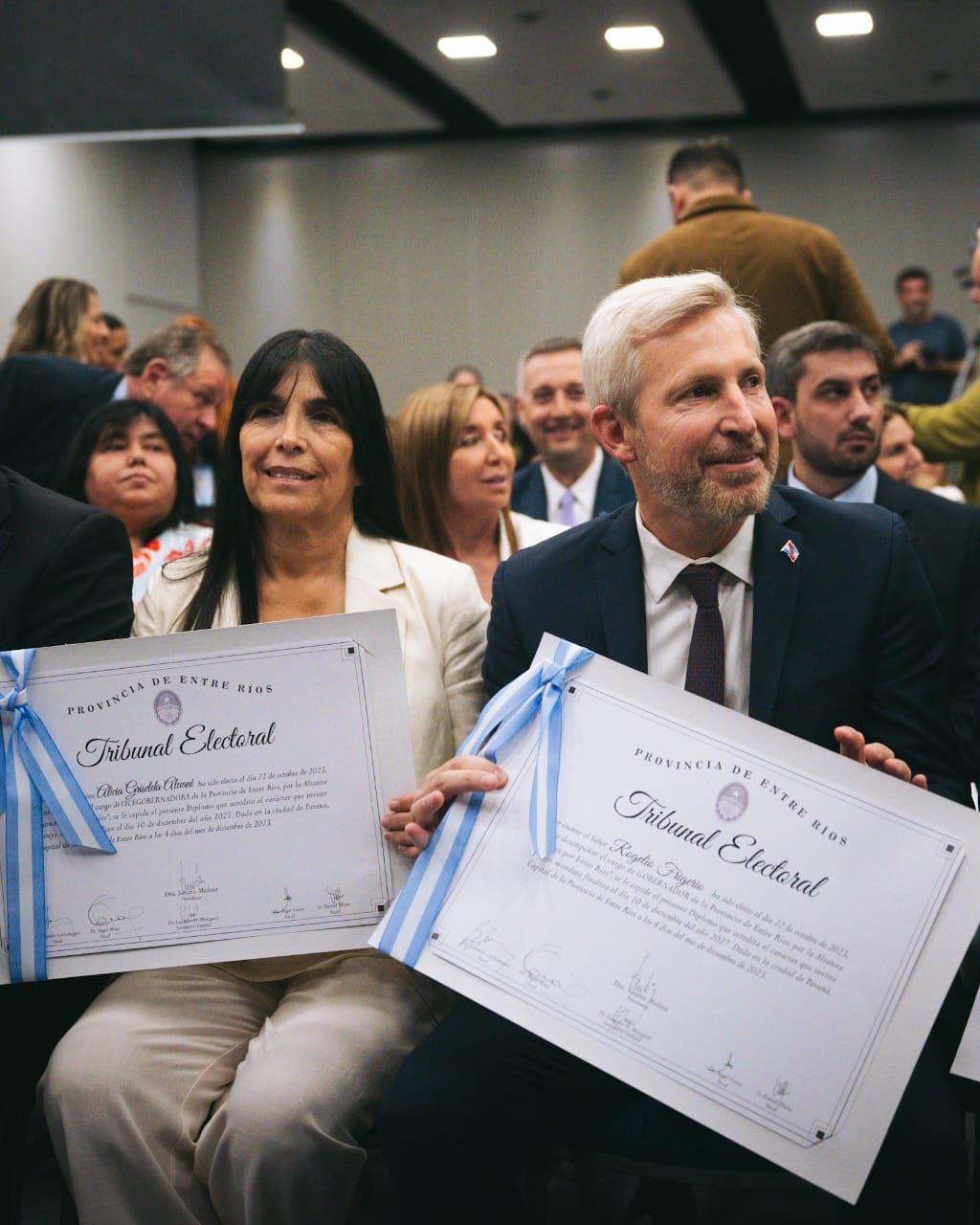“Hoy recibimos los diplomas de gobernador y vicegobernadora electos 2023-2027, funciones que vamos a honrar y a desempeñar con gran responsabilidad y dedicación. Muchas gracias por habernos elegido para llevar adelante la transformación que nuestra provincia necesita”, expresó Rogelio Frigerio en su cuenta de X.