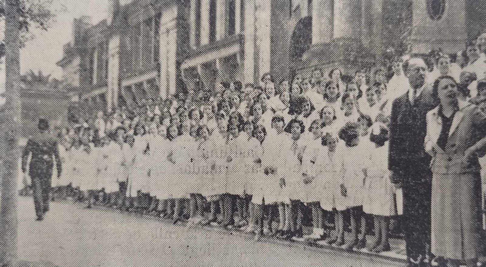 La imagen muestra un desfile cívico-militar, conmemorativo del 9 de Julio, Día de la Independencia; los chicos de las escuelas, verdaderos protagonistas, posan ubicados en las escalinatas de la Escuela Del Centenario. La fotografía fue publicada en EL DIARIO, en 1934.