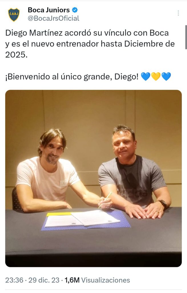 La firma con Boca. Luego del anuncio del Globo, Boca Juniors utilizó sus redes sociales para presentar de manera oficial a su flamante entrenador. “Diego Martínez acordó su vínculo con Boca y es el nuevo entrenador hasta Diciembre de 2025. ¡Bienvenido al único grande, Diego!”, escribió el Xeneize en su cuenta de X junto a una foto del DT acompañado por Marcelo Chelo Delgado, integrante del Consejo de Fútbol del club.