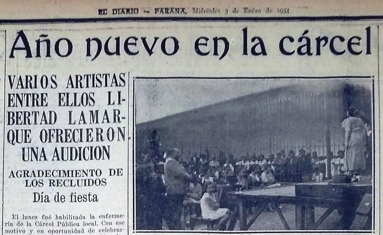 A fines de diciembre de 1933 se anunciaba la inauguración de la enfermería de la cárcel pública de Paraná. El acto se llevaría a cabo el año nuevo de 1934 y “con este motivo se ofrecerá a los recluidos un festival con participación de varios artistas” en donde participaría nada menos que la ya consagrada Libertad Lamarque.